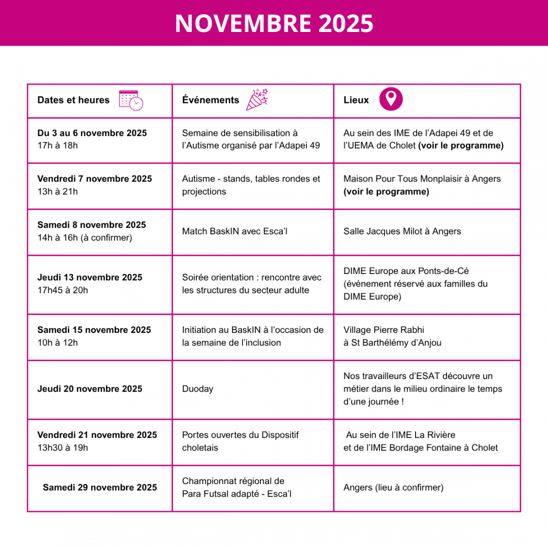 Adapei 49 Actualités Les événements 2025 - 2026 de l'Adapei 49 Partager cette page : Posté le : 14/10/2025 Tags : #Association #Évènements Catégories : Les événements 2025 - 2026 de l'Adapei 49 en cours de rédaction en cours de rédaction
